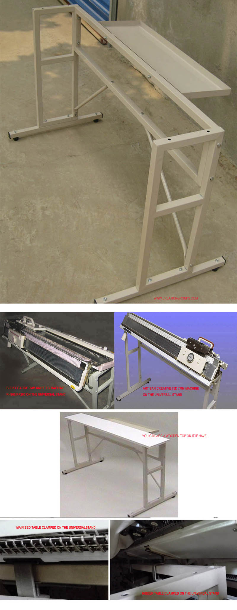 The Universal Knitting Machine Stand or Knitting Machine Table fits Creative/Artisan CG170, GE63,70D,70D Plus and also fit the majority of Brother/KnitKing/SilverReed/Singer/Studio/Knitmaster/Empisal/Bond/Artisan/Creative/Toyota "clamps to a table" type of knitting machine as well as all the plastic bed knitting machines with or without ribber attachment including standard gauge,mid gauge and chunky machines. It is more sturdy than old Herringbone Stand or any Wooden Table.